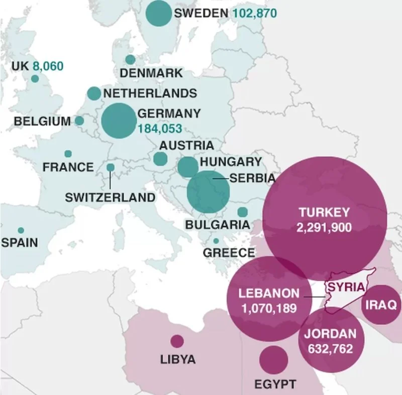Syrian refugees registered in neighbouring countries. Source: UNHCR asylum applications by Syrian nationals from April 2011 - November 2015